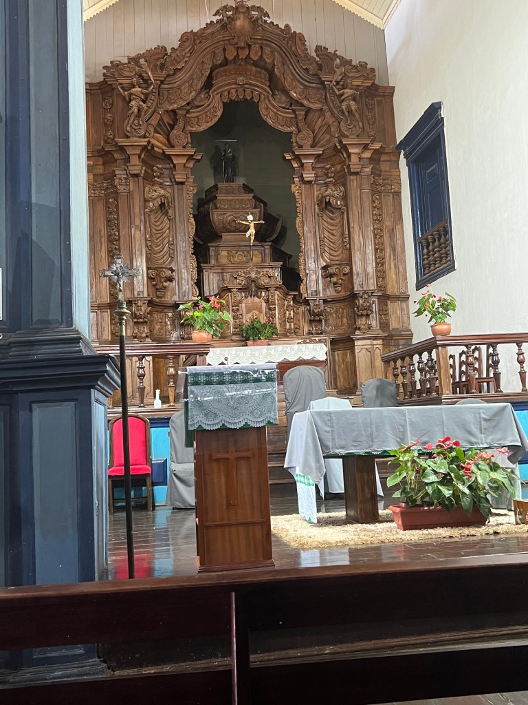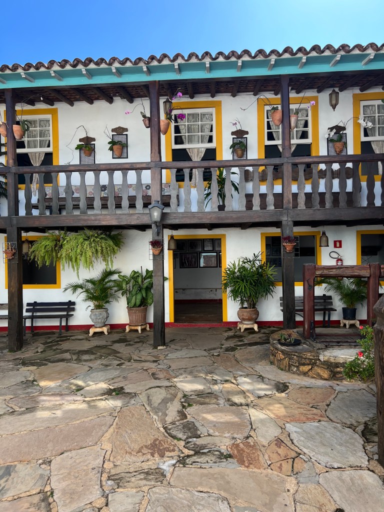 Paracatu Brazil has a population of 93,862. It is in the state of Minas Gerais. The main economy is from gold mining and agriculture.  Paracatu is a busy city with lots of friendly people.  Nick gets the most stares, we think it’s because he is a 6 foot red headed young man.  Yesterday we explored the neighborhood of our hotel and navigated ordering lunch in Portuguese and did a little shopping for basic essentials.  Today we adventured out to the historic city center which was a 20 minute walk through busy streets and residential areas.   It’s winter here, but nothing like the winters in Colorado as it was in the mid 80’s today.  We visited the Igeja Matriz De Santo Antonio Church. It was built in 1730.  We asked someone to see the inside of the church, and we were so glad we asked because it was magnificent. Our phones would not work well inside so the translation of things was difficult so I would like to go back with someone who can translate for us. Right off the altar under the floor they said many of the priests were buried there.  We were honored that they took us on a tour.  The Case De Cultura is a center for the arts.  We met a 13 year old girl taking violin lessons there and she was eager to practice her English.  She said she started teaching herself English when she was 10.  Her English was wonderful and she was really helpful.  She explained that the Casa de Cultura has many classes in the arts.  The living area of the once house to a prominent family in the 1800’s is now an auditorium.   In 1880 the house became a boarding school, and then turned back to a home in 1931 before becoming the Casa De Cultura and the hub for the arts.  Nick and I wandered through the rooms and we saw music lessons, sewing groups and beautiful gardens. Just on a fun note: my teacher’s voice works even if I can’t speak Portuguese. Nick and I were walking back to the hotel after going to the gym at the same time as the kids from the local school was dismissed.  As we walked through this large group of kids we saw a little girl punching a boy while dragging him toward the street, and then some other fights started happening around us.  In my teacher voice I told them to stop and shooed them away from each other, and they quickly complied.  No matter the language barrier, my teacher voice worked.