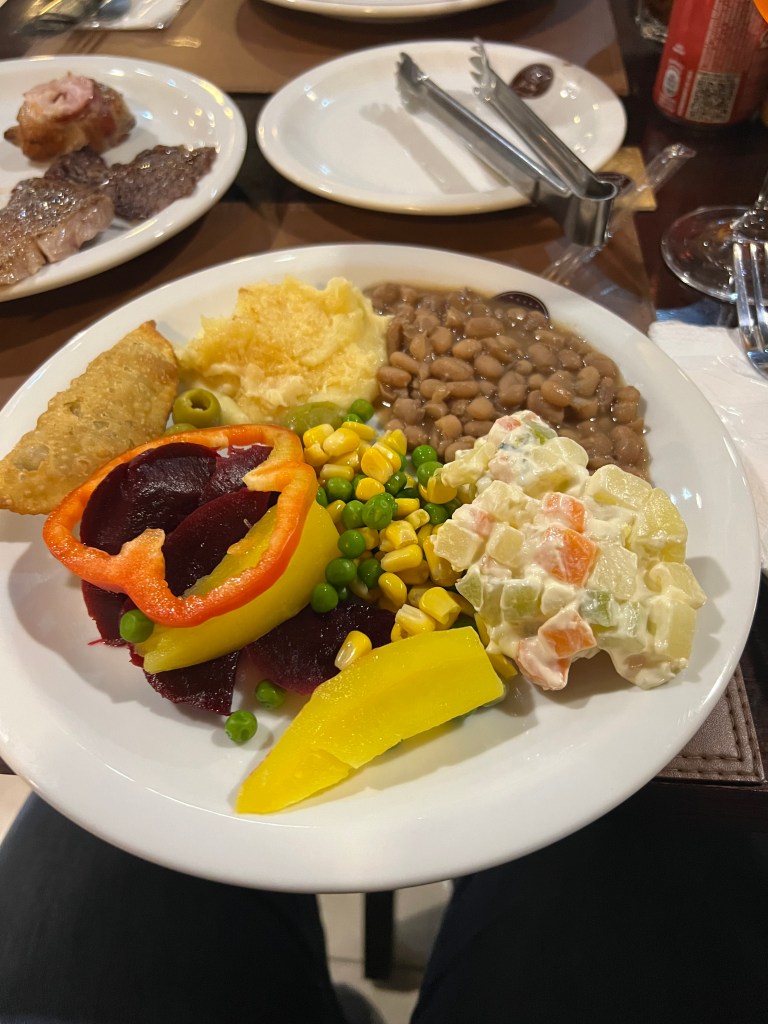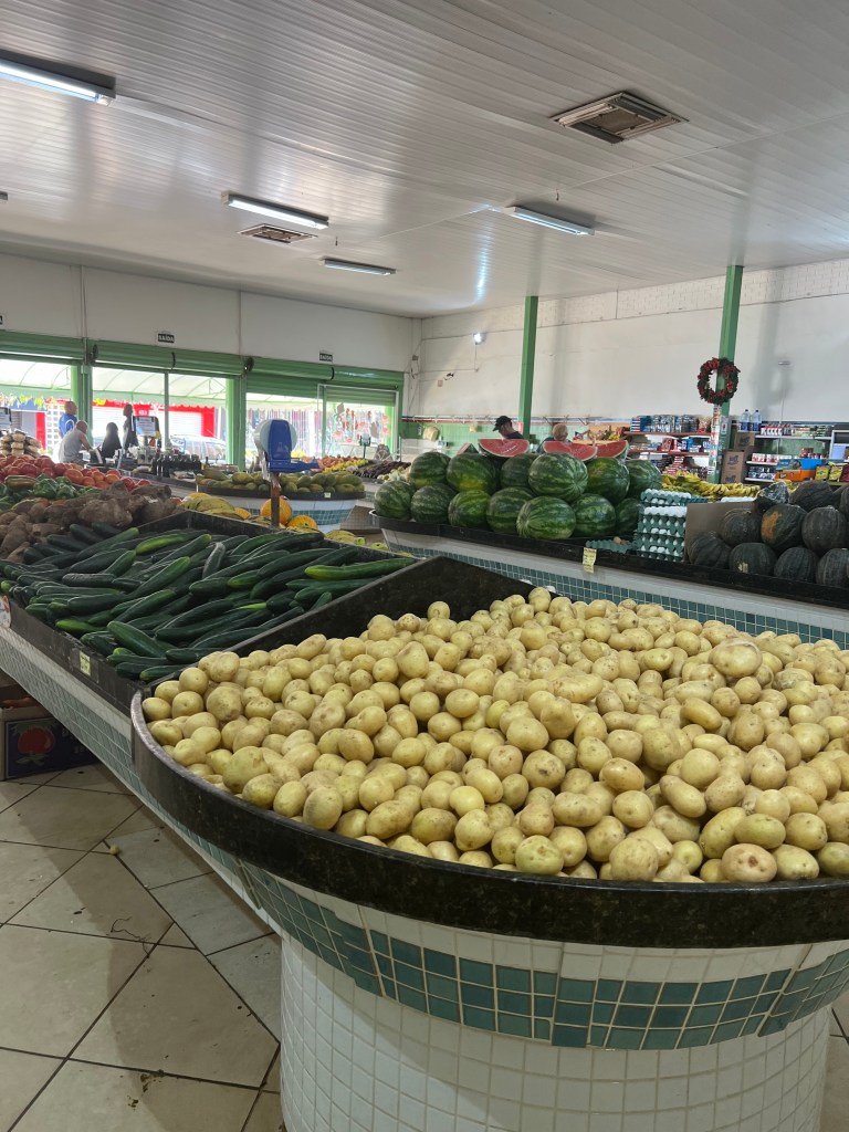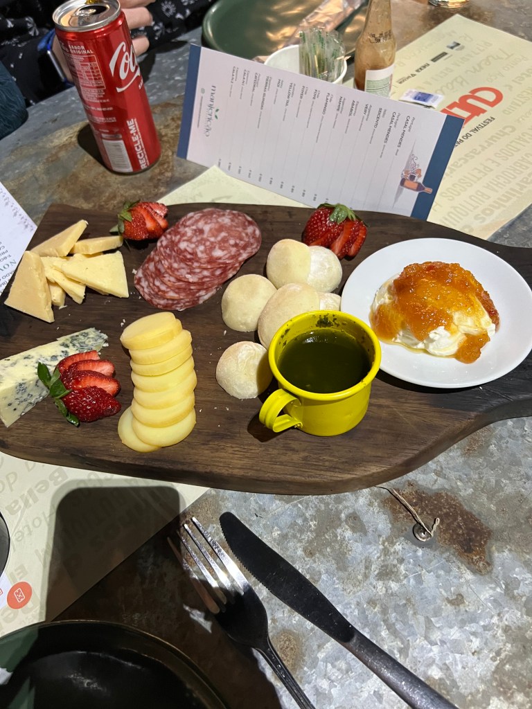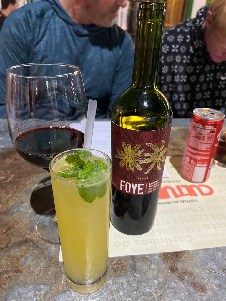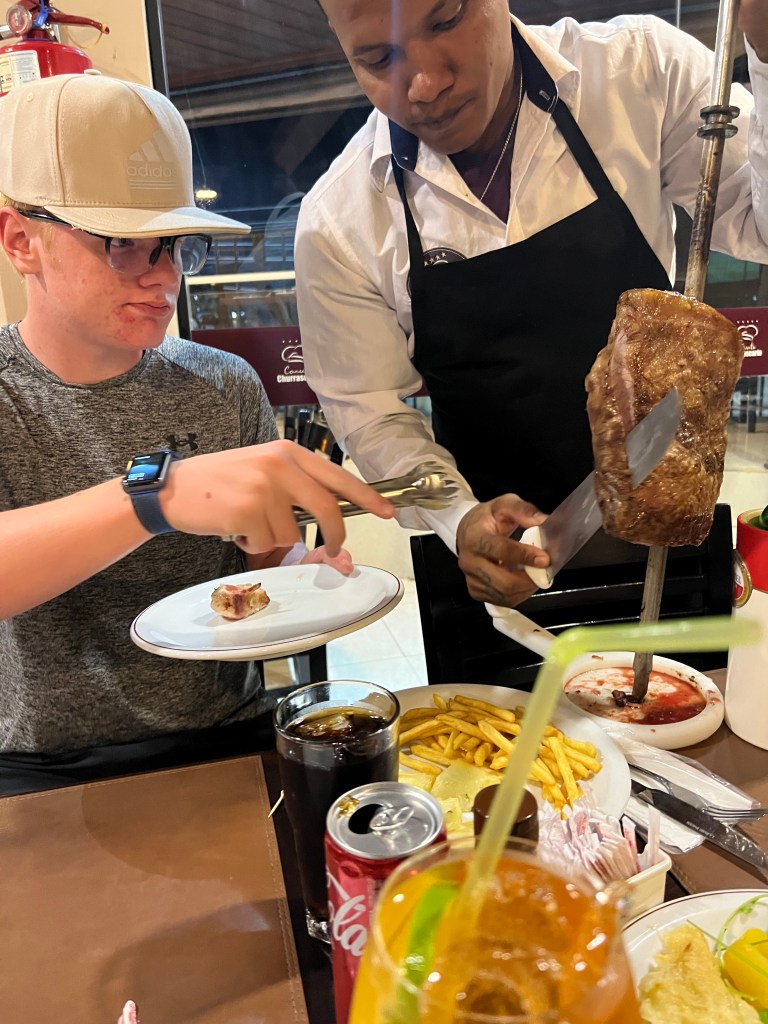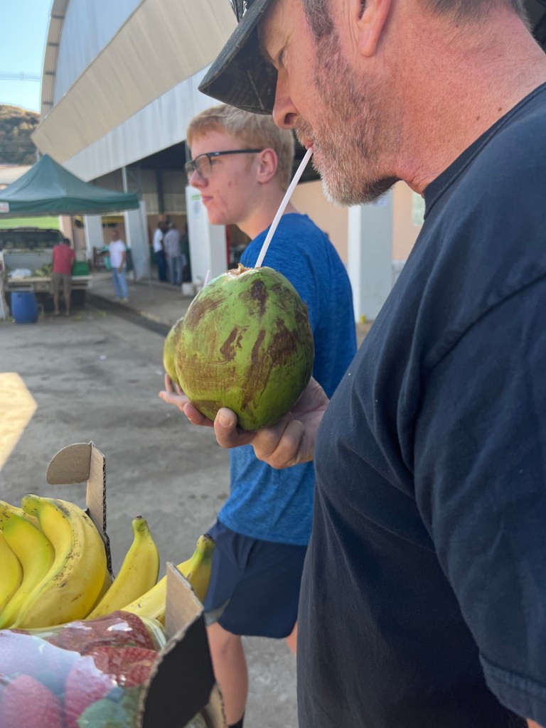 Lots and lots of meat is what is usually for dinner. The food in Paracatu is simple but delicious. Outside the hotel is a pop up tent BBQ where we like to go for a simple and quick meal. You will find all kinds of roasted meats that come with cassava root, cheese bread and a tomato salad. The cassava root is like a less starchy potato that we like to eat with the hot sauces on the picnic tables. Chicken hearts are a common thing roasted and even though those are not my choice Ken says they are good. Nick and I’s favorite restaurant for lunch is across the street there we find roasted meats, different types of tomato and cucumber salads. Nick likes the fried fish and french fries there. French fries are something you find everywhere and they serve them with pretty much everything. The most interesting appetizer with fries came with cheese whiz on top with pork belly. Rodizio pizza places are common here. It’s a bit stressful to figure out when to say no because they come to your table and offer a different type of pizza every few minutes. After the pizza comes the French fries and then fried chicken. When I say pizza it is not like the pizza we have in the United States. Pizza here comes with so many toppings that I would have never thought to put on pizza like, cream corn, bananas, and cream sauces. Our favorite breakfast place serves an avocado toast that Ken and I love and we always order the cappuccino. Nick likes the pancakes there, but you won’t find syrup because they serve them with honey and fruit. The coffee is something to get use to here because it is strong like rocket fuel. I am a person who drinks black coffee, but here I have to add some milk to it. On Sunday’s we go to our favorite breakfast place where the cappuccino tastes like home. We recently went to a new restaurant that is a Rodizio style steak house. We will definitely go back because it was so good. They had lots of side options and then the meat was cut table side with so many options of different kinds of meat. Now lets talk drinks…I am person who enjoys different kinds of drinks, and I have found some I really like. Brazil’s national drink is a Caipirinha. It is a drink made with Cachaca, lime, sugar and mint. It is a very sweet drink but so good. My other favorite drink is creation is made at Liberte. Liberte is a restaurant around the corner from us that has an indoor/outdoor vibe. My favorite drink there is the cerrado flower which has strawberry purée, vodka, lemon soda, lemon juice and a homemade ginger foam. Ken usually orders beer or wine and the wine is not sold by the glass so he leaves with the bottle to enjoy later. Our favorite soda here is called Guarana and is sold here in Brazil. It’s kind of like a cherry ginger ale. On Sundays we go to the farmers market and pick up our produce for the week. You will find lots of fruits, few type of vegetables, meat and fish. We get a coconut to sip on as we shop around.